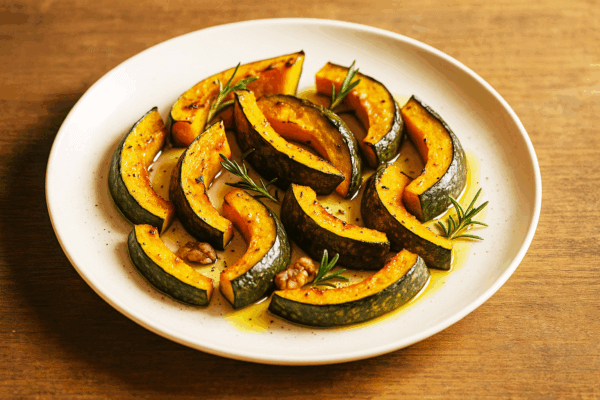 - 香り付け:ボウルにカボチャを入れ、オリーブオイル大さじ2、塩、黒こしょう、刻んだローズマリーを加えて全体をやさしく和える。